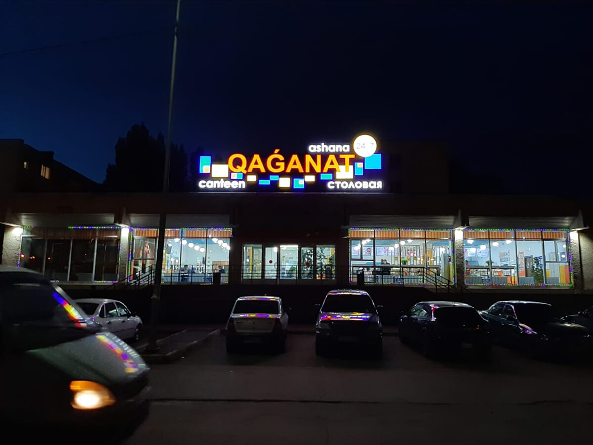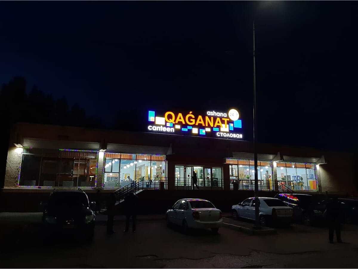 Хотя такие конструкции стоят дешевле объёмных букв, они не уступают им по эффективности в вечернее и ночное время.