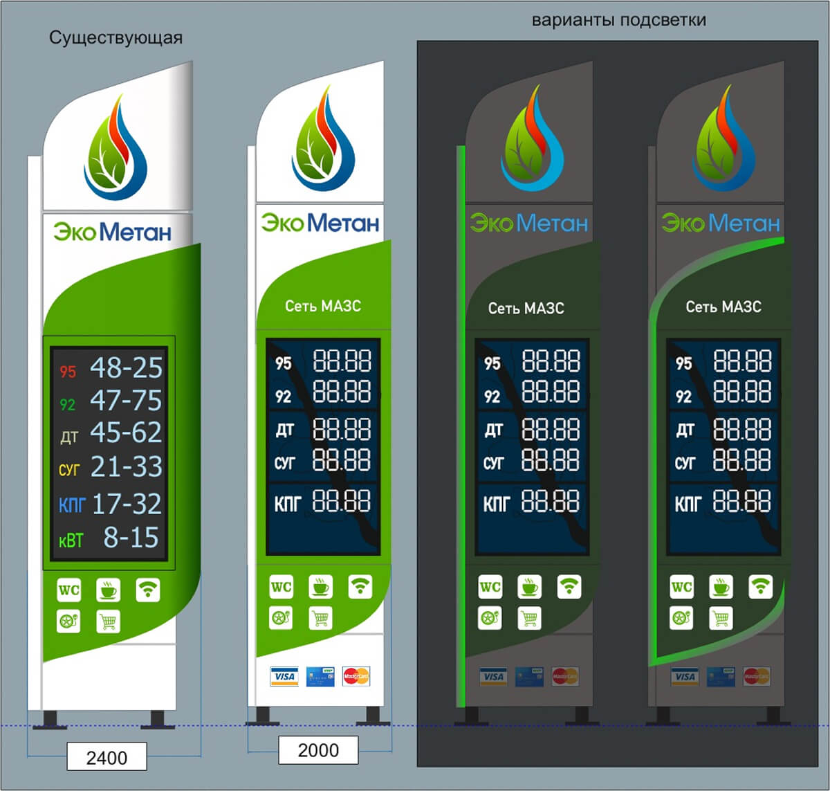 3 разных варианта дизайна и расчета стоимости стелы для АЗС