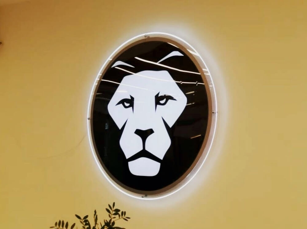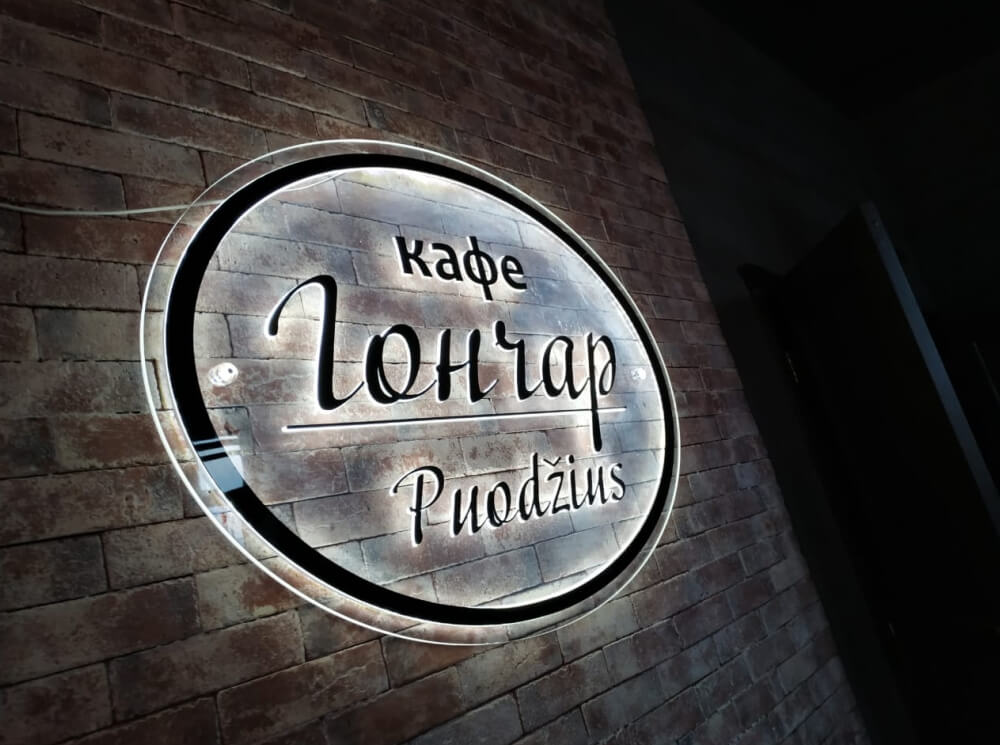 Световая панель из акрилового оргстекла с выгравированным рисунком (логотип или текс). Контуры рисунка наносятся на акрилайты с помощью гравировки, в качестве цветового наполнителя используется немецкая пленка oracal. Подсветка с торцевой стороны, именно поэтому возникает эффект свечения выгравированного контура.